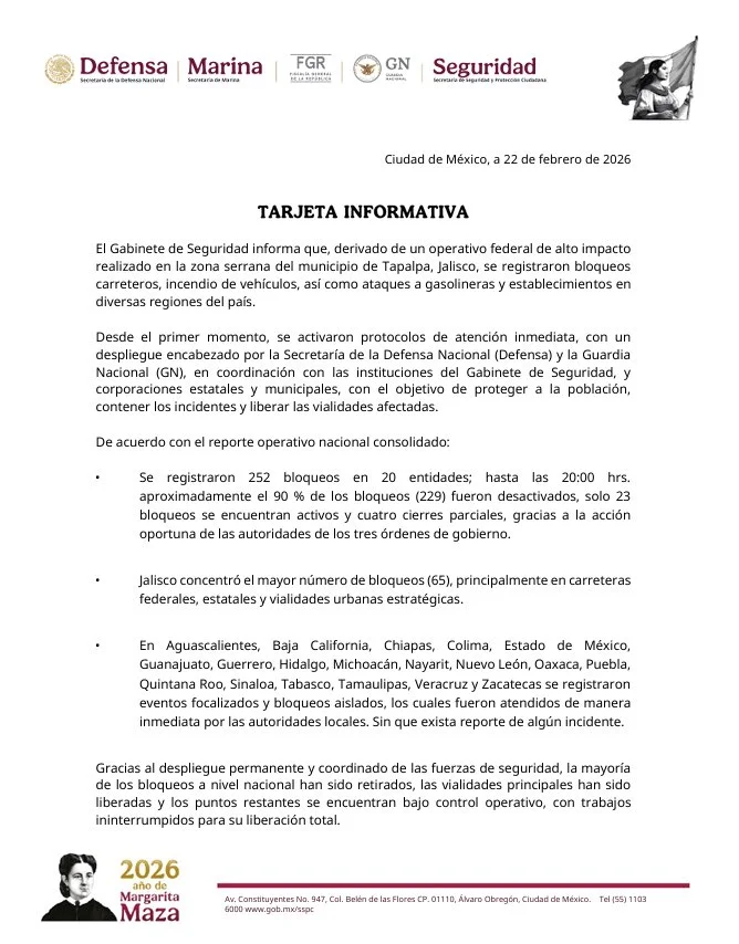 Hasta las 20 horas, el 90 por ciento de los cierres ya habían sido desactivados, mientras que 23 permanecían activos y cuatro presentaban cierres parciales. Las autoridades federales, en coordinación con gobiernos estatales y municipales, mantienen operativos para restablecer la movilidad y exhortaron a la ciudadanía a mantenerse informada únicamente a través de canales oficiales.