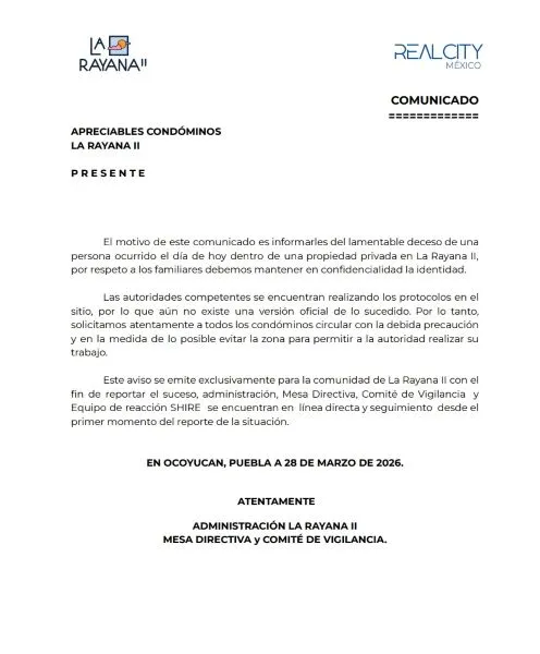 Comunicado La Rayana II / Cortesía Este caso se suma a otro antecedente en la zona. En marzo de 2025, Natalia Andrade, de nacionalidad argentina, fue encontrada sin vida en su domicilio en Lomas de Angelópolis III, también con signos de violencia. Las investigaciones continúan para esclarecer los hechos y dar con el paradero de la presunta responsable. Hechos violentos registrados en Lomas de AngelópolisHace un mes, dos guardias de seguridad del fraccionamiento La Rayana II, en Ocoyucan, resultaron gravemente lesionados tras ser agredidos por un residente y sus acompañantes. De acuerdo con un comunicado de la Administración y la Mesa Directiva, la agresión ocurrió alrededor de las 3:00 horas del 1 de febrero, cuando los elementos fueron atacados físicamente durante su turno. En marzo de 2025, Natalia Andrade, de nacionalidad argentina, fue encontrada sin vida en su domicilio en Lomas de Angelópolis III, también con signos de violencia. Posteriormente, el 10 de abril, vecinas y vecinos del clúster Parque Querétaro se manifestaron para exigir el esclarecimiento de ese feminicidio.
