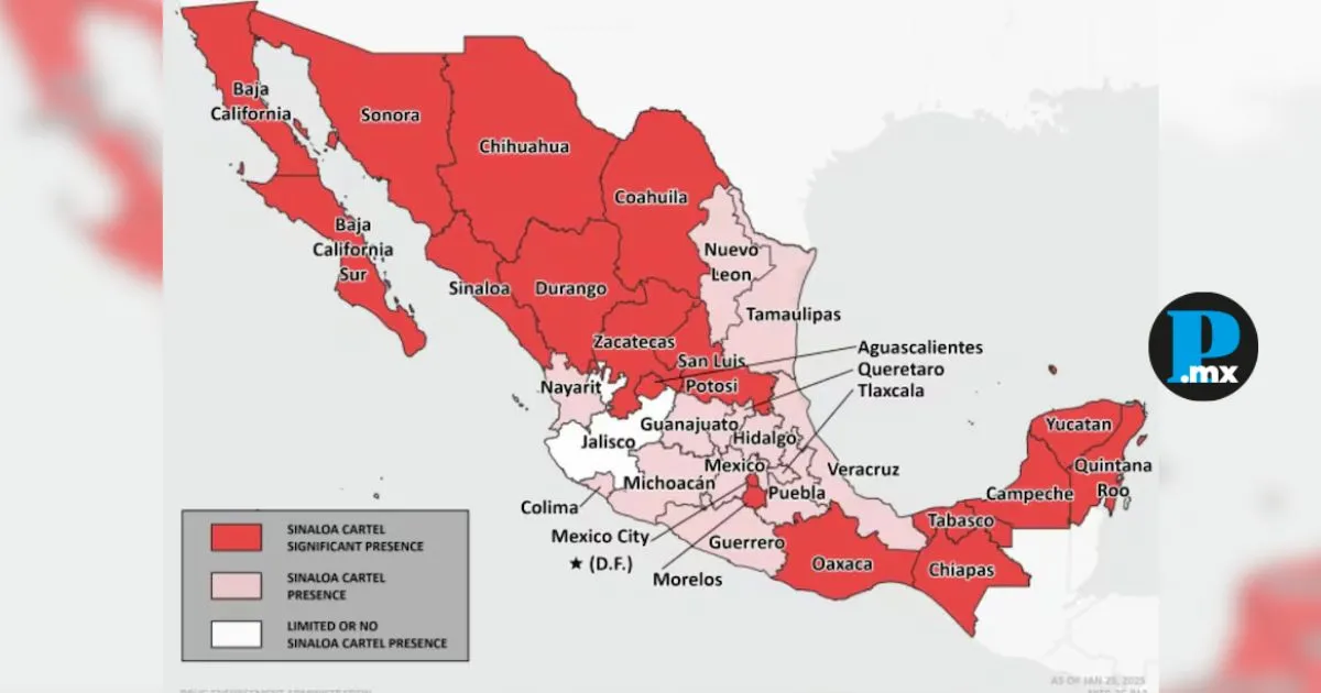 Presencia del CJNG en México / DEA En tanto, se identificaron 16 estados con notable presencia del Cártel de Sinaloa: Baja California, Baja California Sur, Sonora, Chihuahua, Sinaloa, Durango, Zacatecas, Nayarit, San Luis Potosí, Guerrero, Oaxaca, Chiapas, Tabasco, Campeche, Yucatán y Quintana Roo. Puebla figura entre las nueve entidades con presencia intermedia de este grupo criminal, el cual también mantiene operaciones en Coahuila, Nuevo León, Tamaulipas, Aguascalientes, Querétaro, Tlaxcala, Hidalgo y el Estado de México.
