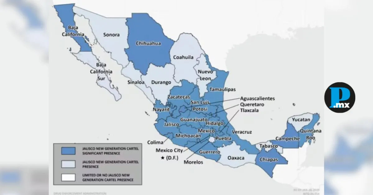 La Administración para el Control de Drogas (DEA) de Estados Unidos identificó a Puebla como una de las 22 entidades del país en donde el Cártel Jalisco Nueva Generación (CJNG) mantiene presencia, principalmente por su ubicación geográfica, que facilita el tránsito de miembros del grupo delictivo. En su informe “Evaluación Nacional de Amenazas por Drogas 2025”, la dependencia estadounidense también indicó que en la entidad se encuentra entre los nueve estados con presencia intermedia del Cártel de Sinaloa. La agencia estadounidense señaló que las regiones centro y norte del país funcionan como corredores estratégicos tanto para la distribución de drogas como para el desplazamiento de integrantes del cártel, facilitando su acceso a la frontera con Estados Unidos y a diversos puertos marítimos. Te puede interesar: Van 47 detenidos por caso Rancho Izaguirre; Jalisco acepta recomendación de CNDH Las 22 entidades en las que hay presencia significativa del CJNG son Aguascalientes, San Luis Potosí, Zacatecas, Tamaulipas, Nayarit, Chihuahua, Baja California, Guanajuato, Querétaro, Hidalgo, Colima, Michoacán, Guerrero, Veracruz, Tlaxcala, México, Puebla, Ciudad de México, Chiapas, Campeche, Jalisco y Quintana Roo. Además, la DEA reporta que el CJNG tiene presencia secundaria en otros estados, aunque en menor grado, como: Nuevo León, Sinaloa, Coahuila, Durango, Tabasco, Yucatán, Morelos, Baja California, Sonora, Guanajuato, Hidalgo, Colima y Michoacán.