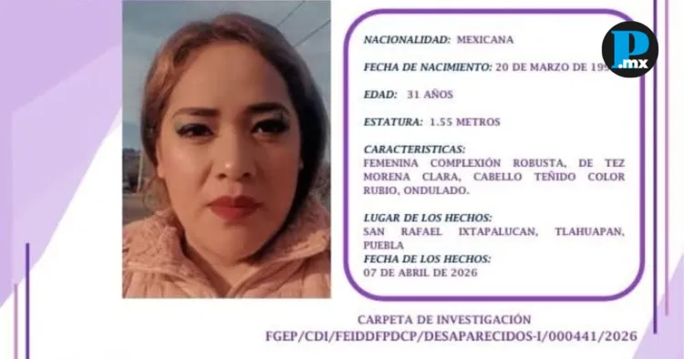 Autoridades del estado de Puebla activaron el Protocolo Alba para localizar a Yazmín Contreras Ríos, de 31 años, quien fue reportada como desaparecida tras ser vista por última vez el 7 de abril de 2026 en la comunidad de San Rafael Ixtapalucan, perteneciente al municipio de Santa Rita Tlahuapan. De acuerdo con el boletín emitido por la Fiscalía General del Estado de Puebla, la mujer es de nacionalidad mexicana, mide aproximadamente 1.55 metros, tiene complexión robusta, tez morena clara y cabello teñido de rubio con textura ondulada. El día de su desaparición vestía chamarra negra larga, sudadera con estampado de búhos, pantalón negro de mezclilla y tenis azules marca Puma con franja blanca. Como seña particular, portaba una cadena color rojo sin dije. Familiares y autoridades señalaron que, desde el momento de su desaparición, no se tiene información sobre su paradero, por lo que se teme por su integridad. Ante ello, se solicita la colaboración de la ciudadanía para aportar cualquier dato que permita ubicarla. Te puede interesar: Detienen a tres hombres por extorsión en Puebla; exigían 4 mdp La Fiscalía destacó que toda información será recibida de manera confidencial y anónima a través de los números telefónicos 22 12 83 81 42 y 22 22 14 64 02, así como el correo electrónico boletin.protocolo.alba.fge@fiscalia.puebla.gob.mx. Cualquier dato, por mínimo que parezca, puede ser clave para dar con el paradero de Yazmín Contreras Ríos.
