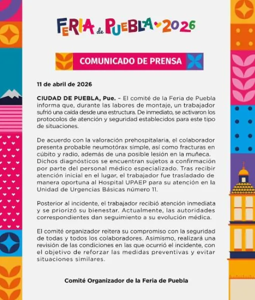 Un trabajador resultó lesionado tras caer de una estructura mientras participaba en las labores de montaje de la Feria de Puebla 2026, informó el comité organizador del evento. El accidente ocurrió durante los preparativos previos a la inauguración, lo que activó de inmediato los protocolos de emergencia y atención médica en el sitio. De acuerdo con los primeros reportes, el trabajador presentó diversas lesiones tras la caída. Entre los daños detectados en la valoración inicial se encuentran fracturas en el brazo, posibles lesiones en la muñeca y un probable neumotórax, aunque el diagnóstico final será determinado por especialistas.