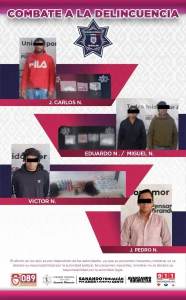 El reforzamiento de operativos y la videovigilancia en Tehuacán continúa generando resultados en materia de seguridad, con detenciones por narcomenudeo, robo y recuperación de vehículos con reporte de robo, en acciones coordinadas que buscan frenar la incidencia delictiva en el municipio. En una primera intervención, elementos de la Dirección de Seguridad Pública Municipal aseguraron a J. Carlos N, a quien le fueron encontradas 12 bolsas tipo ziploc con sustancia con características similares a la metanfetamina. Te puede interesar: Tehuacán se integra a la estrategia nacional "Atención a las Causas" para fortalecer la seguridad Asimismo, en otra acción policial fueron detenidos Eduardo N y Miguel N, quienes presuntamente portaban 36 bolsas con producto similar a la metanfetamina, por lo que fueron puestos a disposición de la Fiscalía General del Estado (FGE) por su probable responsabilidad en delitos contra la salud. Con estas detenciones, la Policía Municipal asestó un nuevo golpe a presuntas redes de narcomenudeo que operan en el municipio, fortaleciendo las labores de prevención y vigilancia en distintos puntos de la ciudad.