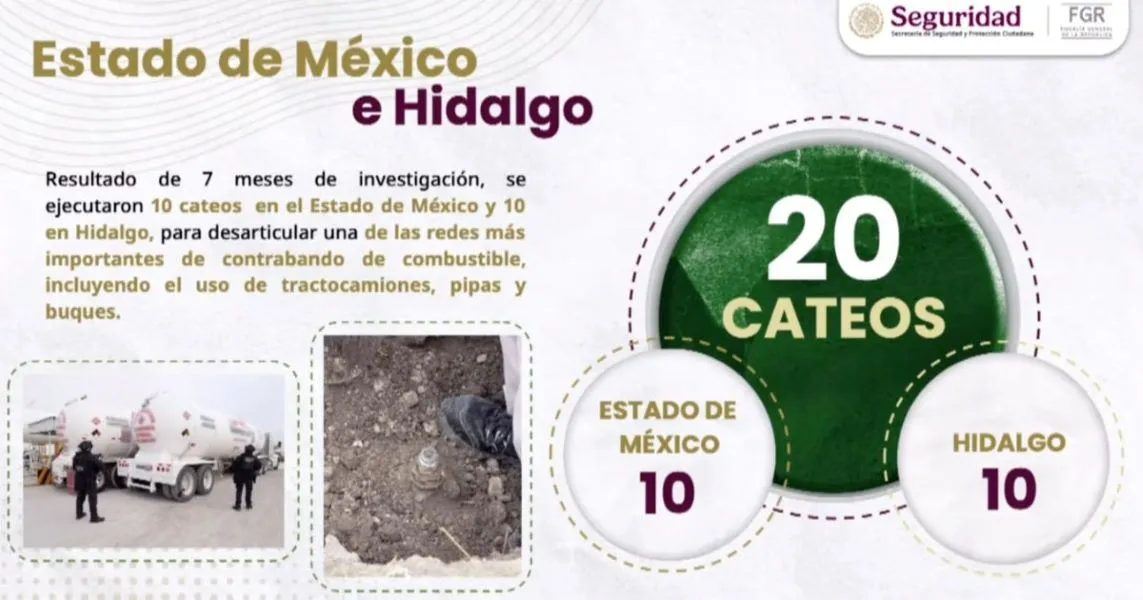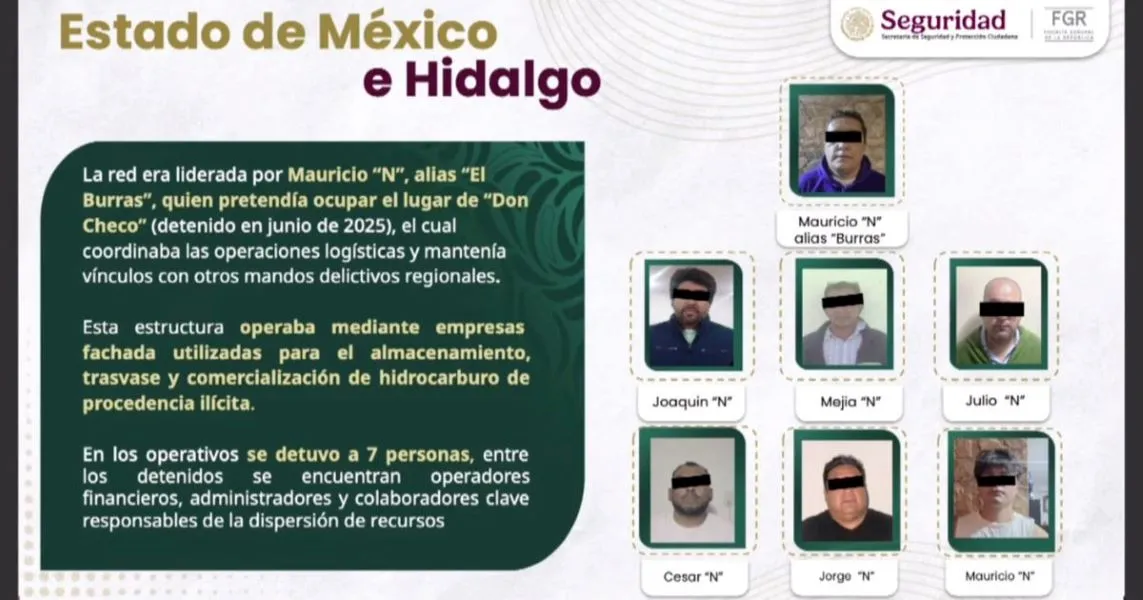 El Gobierno de México desmanteló una red de huachicol que operaba en el centro del país, con presencia en el Estado de México, Hidalgo y la Ciudad de México, informó el secretario de Seguridad y Protección Ciudadana (SSPC), Omar García Harfuch. En rueda de prensa, informó que el operativo fue resultado de siete meses de trabajos de inteligencia e investigación, en coordinación interinstitucional entre la SSPC, la Fiscalía General de la República (FGR) —a través de la Fiscalía Especializada en Materia de Delincuencia Organizada y la Agencia de Investigación Criminal—, así como la Secretaría de Marina (Semar) y el Centro Nacional de Inteligencia. Te puede interesar: Harfuch niega presencia de agentes extranjeros en operativos de seguridad en México De acuerdo con las autoridades, la organización criminal estaba dedicada al robo, almacenamiento y comercialización de combustible ilícito, utilizando una estructura empresarial para ocultar sus operaciones. ![]() El esquema delictivo, según el reporte oficial, permitía la extracción de aproximadamente 1.5 millones de combustible a la semana, los cuales eran trasladados a distintos predios y centros de almacenamiento para su posterior distribución en la región centro del país. Como parte de las acciones operativas, se ejecutaron 20 órdenes de cateo, de las cuales 10 se realizaron en el Estado de México y 10 en Hidalgo. Los inmuebles intervenidos eran utilizados como centros logísticos para el resguardo, distribución y manejo del hidrocarburo robado. ![]() Durante el operativo fueron detenidas siete personas, entre ellas Mauricio N, alias “El Burras”, identificado como presunto líder de la organización y vinculado con una cédula criminal. También fue capturado Mauricio N, alias “Pepón”, señalado como operador logístico y financiero. Entre los demás detenidos se encuentran Jorge N, identificado como administrador de gaseras utilizadas para el blanqueo de recursos; Joaquín Arturo N, alias “Coquis”, operador logístico; Julio César N, encargado del envío de pipas; otro Julio César N, alias “Pingüino”, vinculado a la extracción de hidrocarburos; y Lorenzo Javier N, relacionado con la facturación del combustible robado.