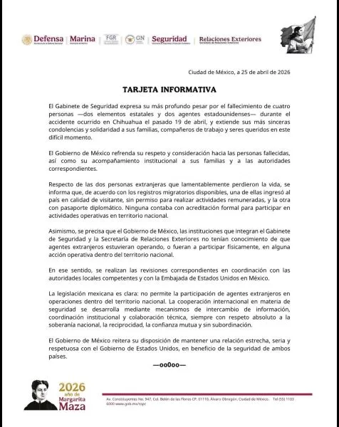 Las autoridades federales precisaron que ni el Gobierno de México, ni las instituciones que integran el Gabinete de Seguridad, ni la Secretaría de Relaciones Exteriores (SRE) tenían conocimiento de que agentes extranjeros estuvieran operando o participando físicamente en acciones dentro del país. ![]() Ante esta situación, se informó que ya se llevan a cabo investigaciones en coordinación con autoridades locales de Chihuahua y con la Embajada de Estados Unidos en México, con el objetivo de esclarecer las circunstancias en las que ocurrieron los hechos. El Gabinete de Seguridad subrayó que la legislación mexicana no permite la intervención de agentes extranjeros en operaciones dentro del territorio nacional. También precisó que la cooperación internacional en materia de seguridad se realiza mediante intercambio de información, coordinación institucional y colaboración técnica, bajo principios de respeto a la soberanía, reciprocidad y confianza mutua, sin subordinación.