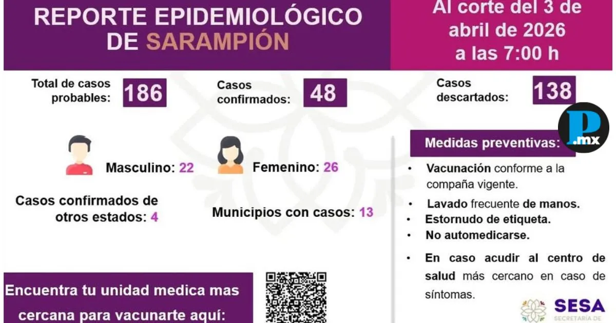 Según el reporte epidemiológico con corte al 3 de abril, 22 hombres y 26 mujeres han dado positivo. Además, se han registrado 186 casos probables y se descartaron 138. La cifra de municipios afectados pasó de 8 al 27 de marzo a 13 al 3 de abril, aunque no se detallaron los nombres. El funcionario recordó medidas preventivas como la vacunación, el lavado frecuente de manos, el estornudo de etiqueta, evitar la automedicación y acudir al centro de salud en caso de síntomas. Te puede interesar: Sesa confirma 27 casos de sarampión y tres defunciones en Tlaxcala No obstante, con las celebraciones de Semana Santa, dichas medidas preventivas fueron pasadas por alto por cientos de paseantes, que abarrotaron balnearios y centros recreativos de Tlaxcala durante el fin de semana. Es preciso recordar que el primer caso se confirmó el 14 de enero en un hombre de 31 años. Posteriormente, el 29 de enero se registró el fallecimiento de un infante de 13 meses originario de Puebla, atendido en el Hospital de San Pablo del Monte y trasladado al Hospital Infantil de Tlaxcala, donde murió por complicaciones al no contar con esquema completo de vacunación.