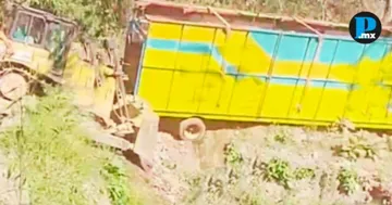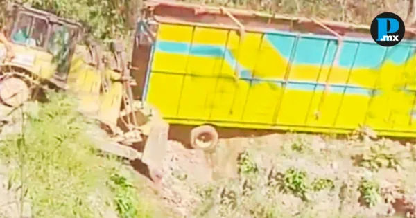 Un tráiler cargado con juegos mecánicos casi cae a un barranco en la Sierra Norte de Puebla; no se reportaron lesionados